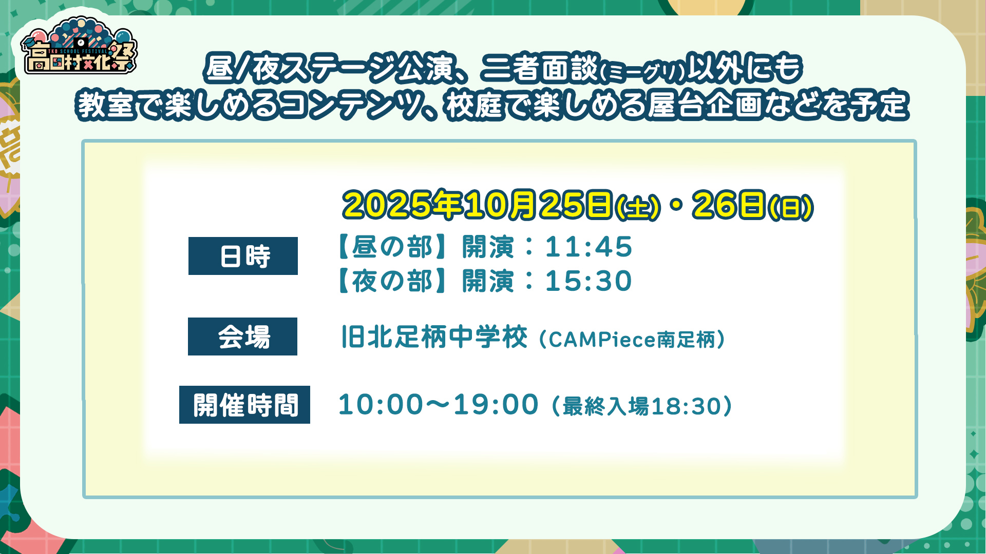 ※各部ステージ公演、二者面談(ミーグリ)以外にも、教室で楽しめるコンテンツ、屋外で楽しめる屋台企画などを計画しております。詳細は追って高田村文化祭公式Xにて告知いたします。